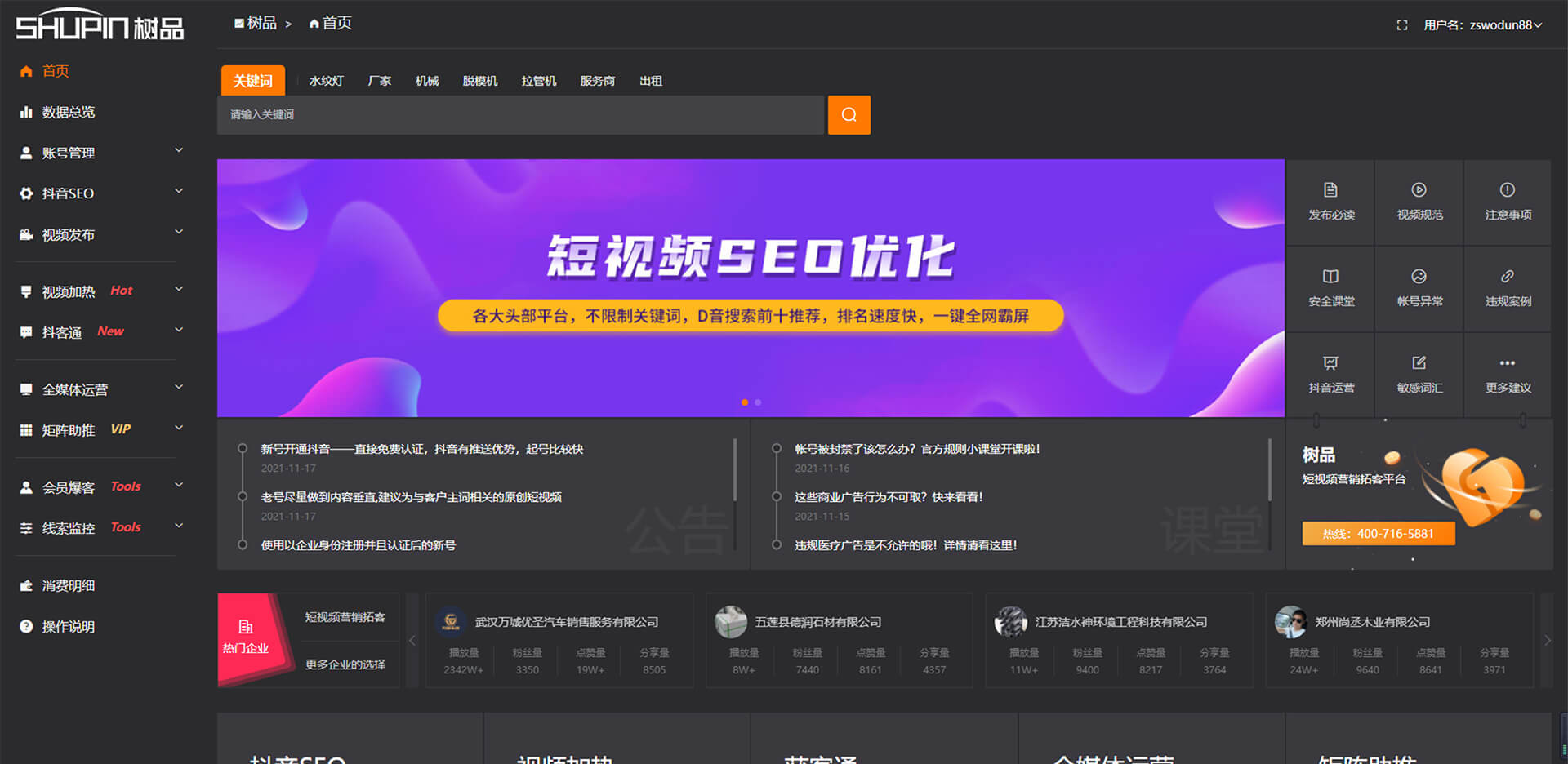 幫助企業(yè)解決在短視頻營銷中的內(nèi)容生產(chǎn)、賬號搭建、賬號運營 、精準低成本引流、業(yè)務場景、服務場景、服務效率等問題的短視頻營銷拓客平臺。